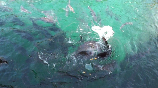 九十九湾で遊覧船に乗り、魚の餌付け体験に子供たちは大喜びでした。