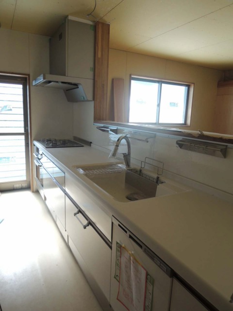 キッチンから、南側の窓まで少し遠いので、キッチン内が明るく見えるように、扉や人造大理石カウンターは白にしました。