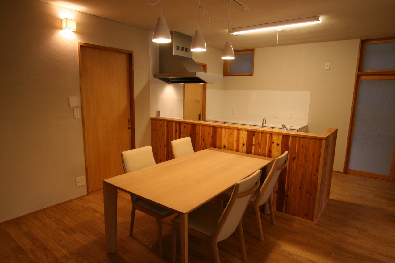 ↑キッチン手元隠し壁には杉板を張ってあります。