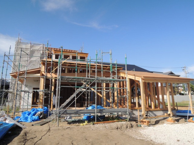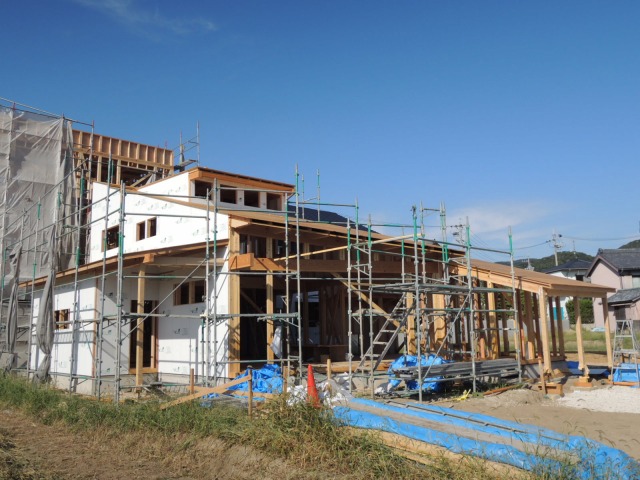 柱や梁など木構造体の外側に白い、耐力面材のモイスTMが張られ、外形が見えてきました。