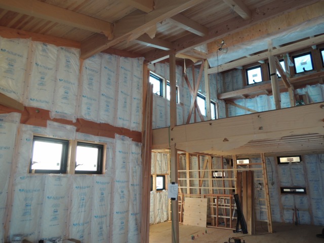 リビングなどの天井は、杉三層パネル(Jパネル)あわらしなので、この上に両面遮熱アルミ張りの発泡系断熱材(サーマックスSⅡ)をのせてあります。