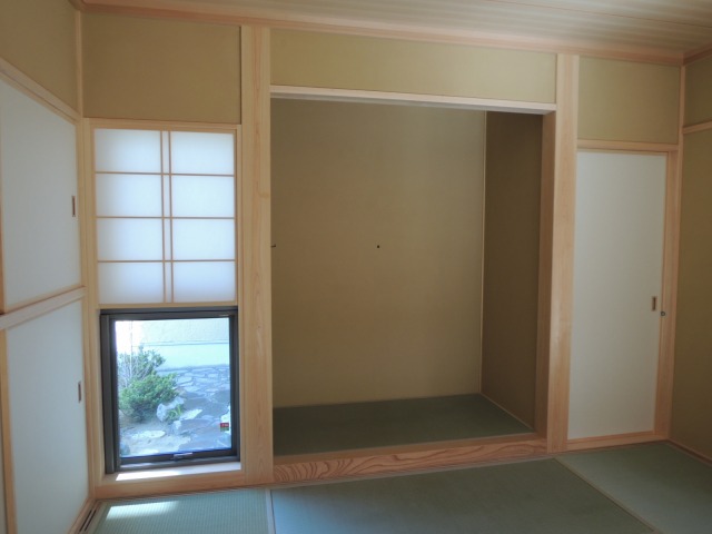 ↑床の間脇の窓には雪見障子が設置され、上へ上げると、中庭4が見えます。(庭工事中)
