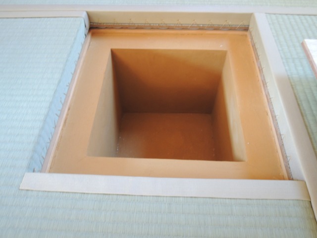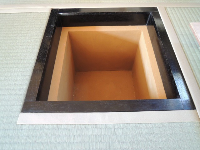 ↑茶道をたのしむことができるよう、畳には炉が切ってあり、小さな炉畳を外したところ。