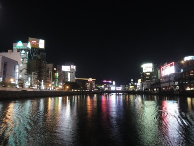 ↑天神へ移動し、遊覧船に乗り、那珂川沿いの夜景を楽しみました。