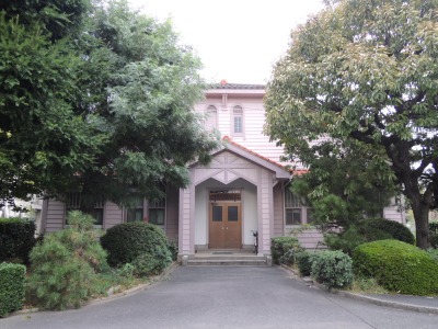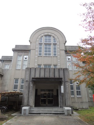 ↑コクリート打ち放しのモダニズム建築の記念講堂。建築学科教授であった光吉健次さんの設計。
