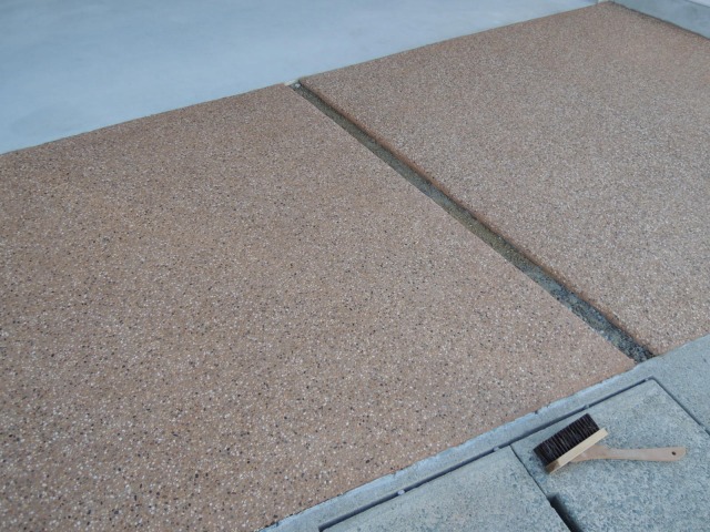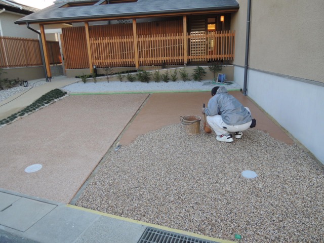 駐車場の舗装は、洗い出し基材を流し込んでふき取り、完成しました。