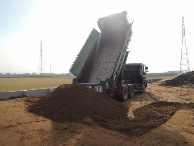 土留めの擁壁ができたので、ダンプで運んできた土をどんどん入れています。