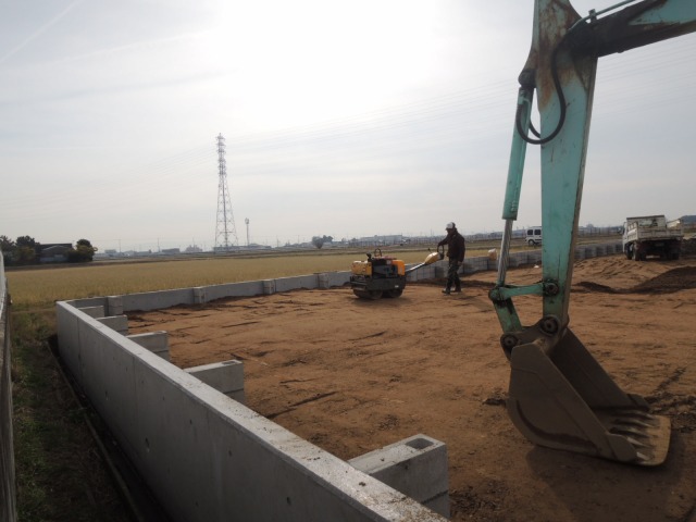 土を入れたら、転圧、その上に土を入れて、転圧というように、何層にも転圧をかけながら、しまった地盤にしていきます。