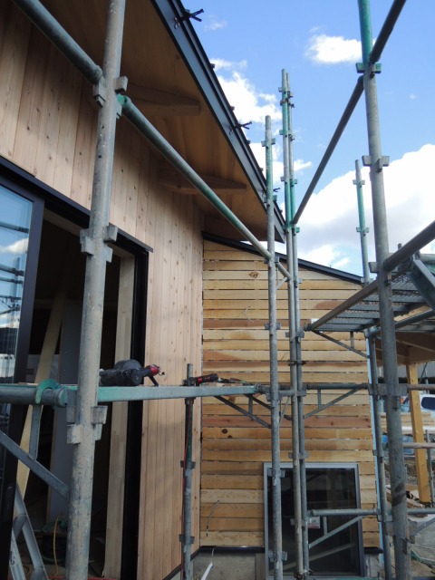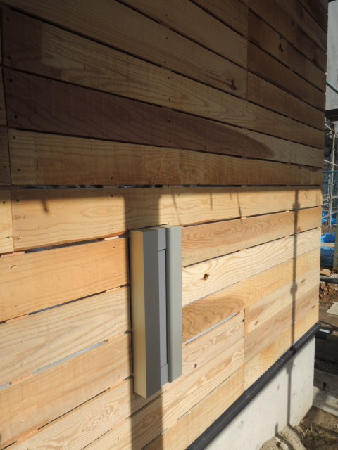 中央棟南外壁に、赤身の杉板が張られました。