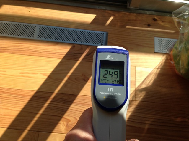 ↑南の窓際の床温度は、24.9℃と暖かいです。奥に見えるのは吹出しグリルです。
