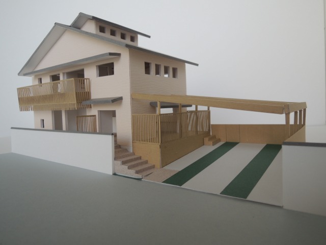 なるべく、周囲に、日影や圧迫感、通風などの影響を与えないことを考えて配置や家の形などを考えました。