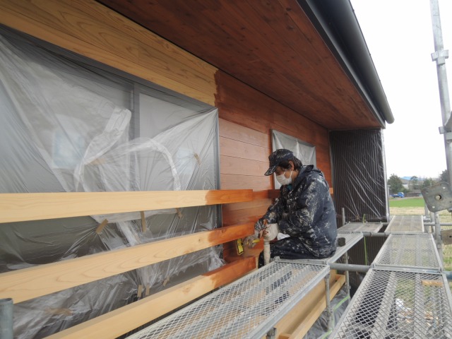 南外壁の杉板や手摺兼用物干しバーを塗装しています。