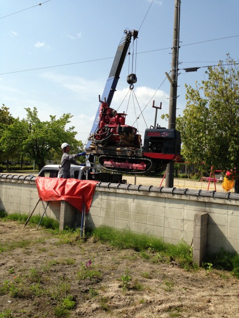 敷地内にボーリング機械が入れないことが、事前の調査会社の下見(過去ブログ)で分かっていたので、万年塀の上をクレーンで吊り上げて、搬入してます。