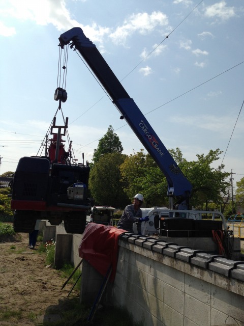 ↑クレーンでボーリング機械を吊り上げます。