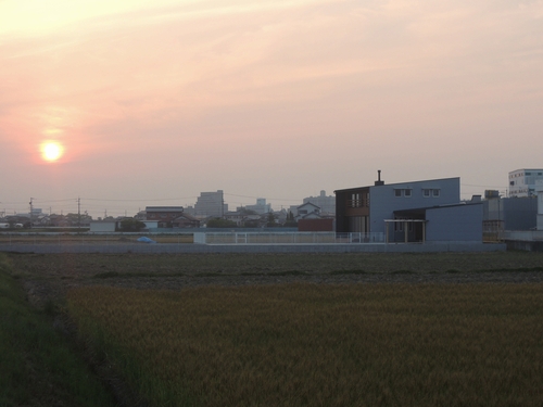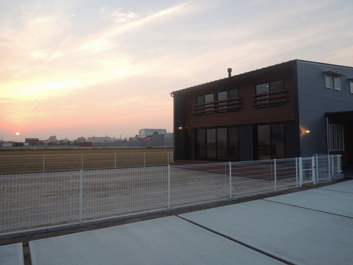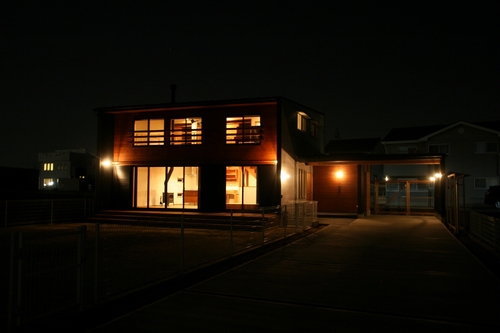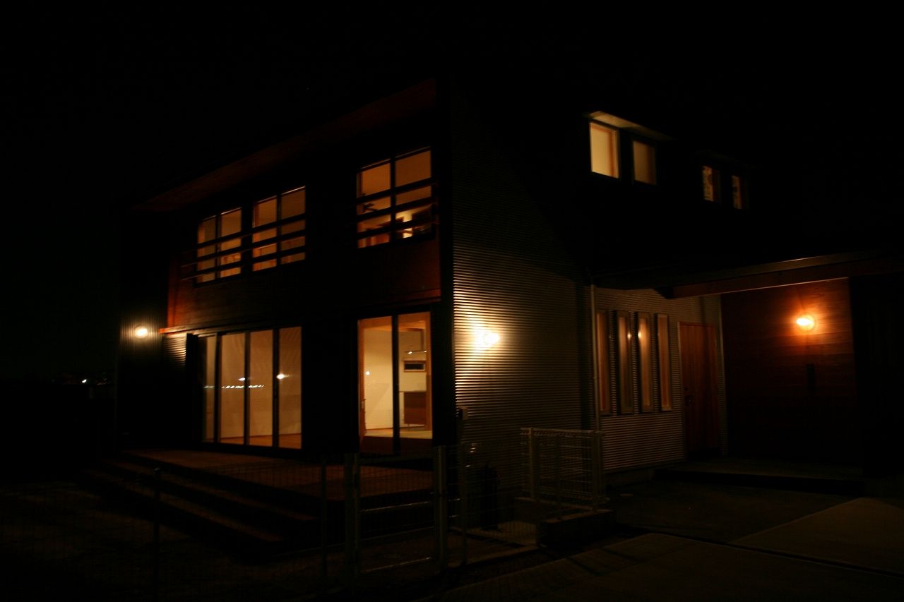 昼は室内が外からよく見えないので、家の奥行感がありませんが、夕方や夜になると、室内が見えて、奥行感が出て、袖壁と2階庇で「囲む」家というコンセプトが、よく分かるようになります。