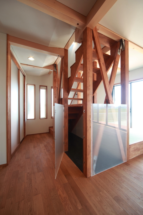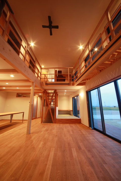 吹抜の回りをぐるりと、廊下とすのこ床(光と風が通ります)の吹抜縁が「囲んで」います。