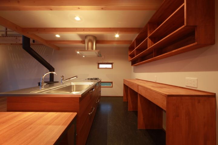 キッチンとダイニングの天井は、梁をあらわしにして、木のあたたかみを演出しています。