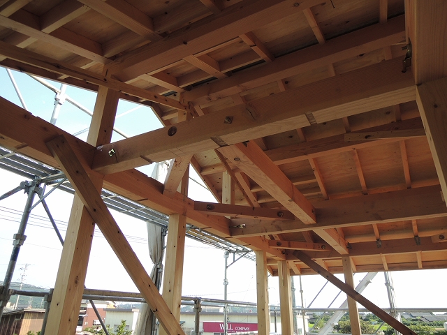 通常の屋根のように、母屋(もや)という構造部材を軒先まで伸ばして、その上に、垂木(たるき)という角材を屋根勾配に合わせて並べるのではなく、屋根面に、はしご状に構造材を組むことにより、母屋を伸ばさないで垂木を並べることができます。