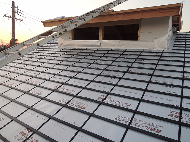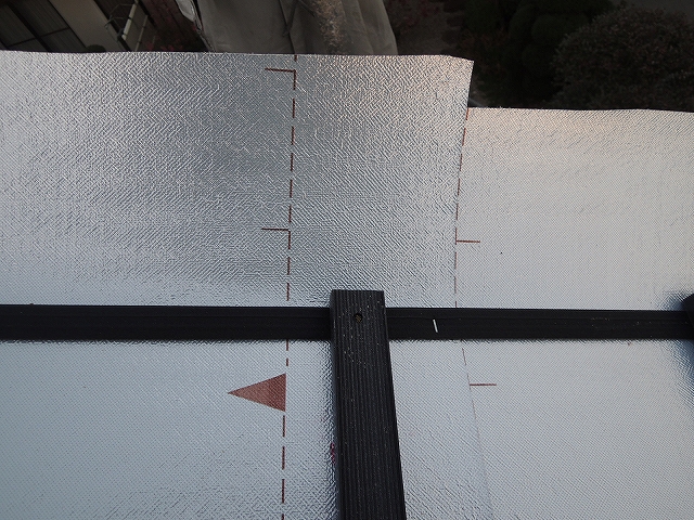 屋根野地板の上に、遮熱透湿防水シート「遮熱ルーフエアテックス」が張られました。