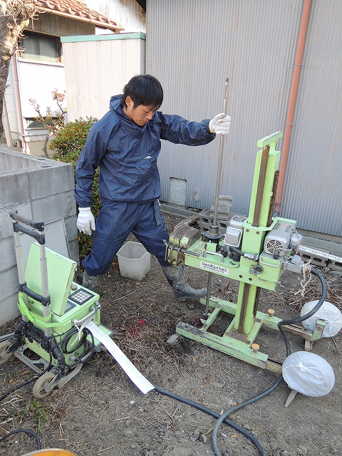 敷地真ん中で↑ボーリング調査を、さらに建物の4隅となる直下で、↓スエーデン式調査をしました。