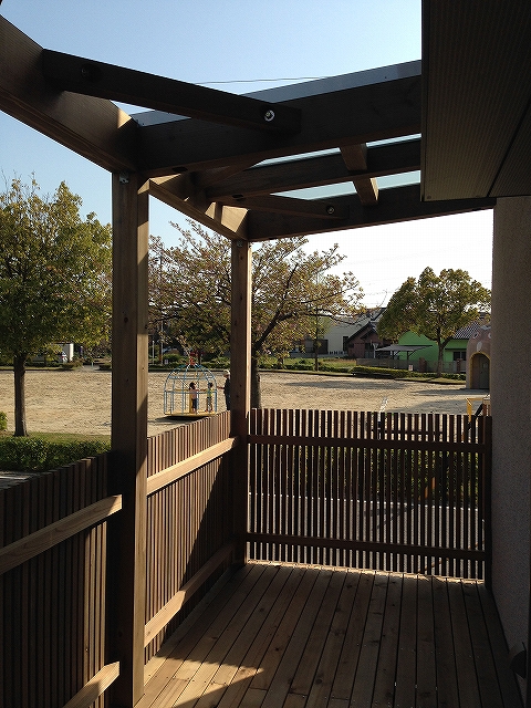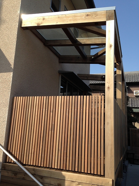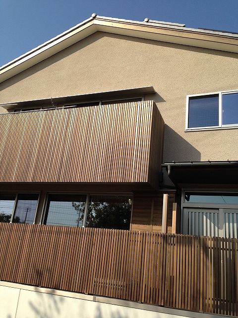 外縁2(そとえん)と呼ぶウッドデッキに杉の手摺縦格子が設置されました。