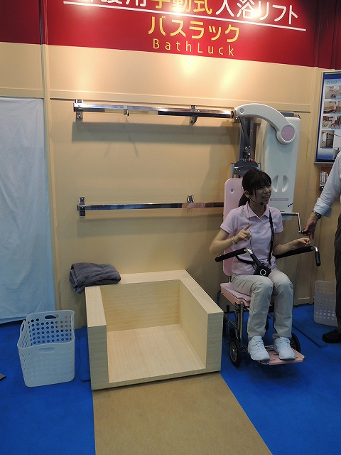 写真の商品とは違い、浴槽の上に置いて使うものです。電動で座面が下がります。)
