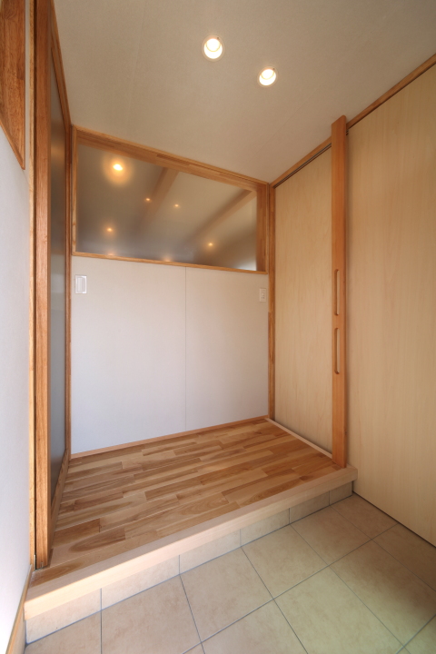 玄関・ホール。右手側はウォークスルーできる玄関収納の引違戸。