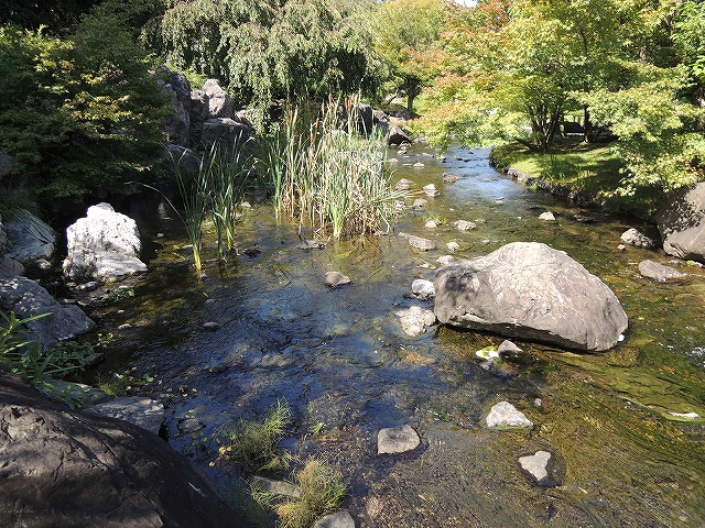 池泉廻遊式庭園で中部地方の地形をモチーフに、築山を「御嶽山」、そこからの流れを「木曽川」、