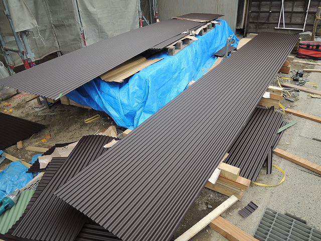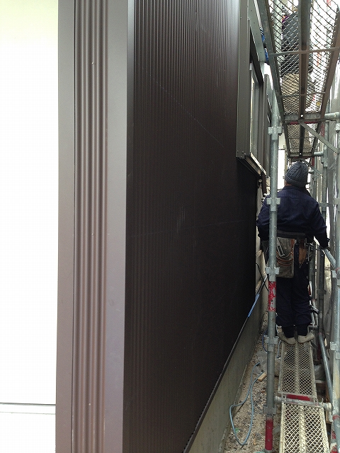 外壁のガルバリウム鋼板を張っています。小波張りです。