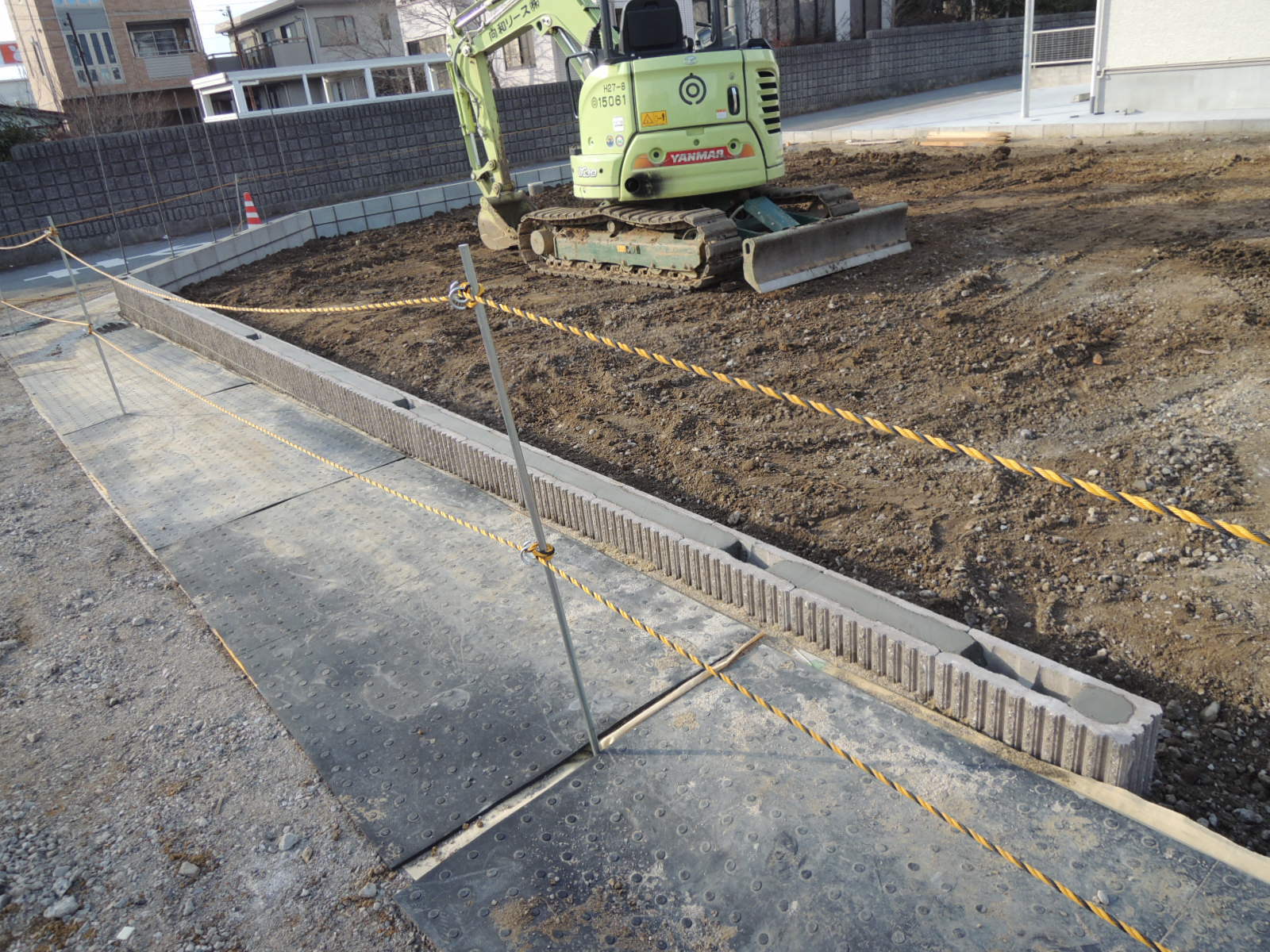 盛り土を行いますが、そのための土留め擁壁として、また、道路境界線沿いにフェンスをつくりますが、その基礎ともなります。