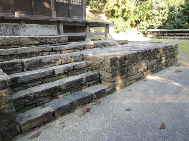 社殿の基礎や階段も同じ積み方の雲母片岩です。