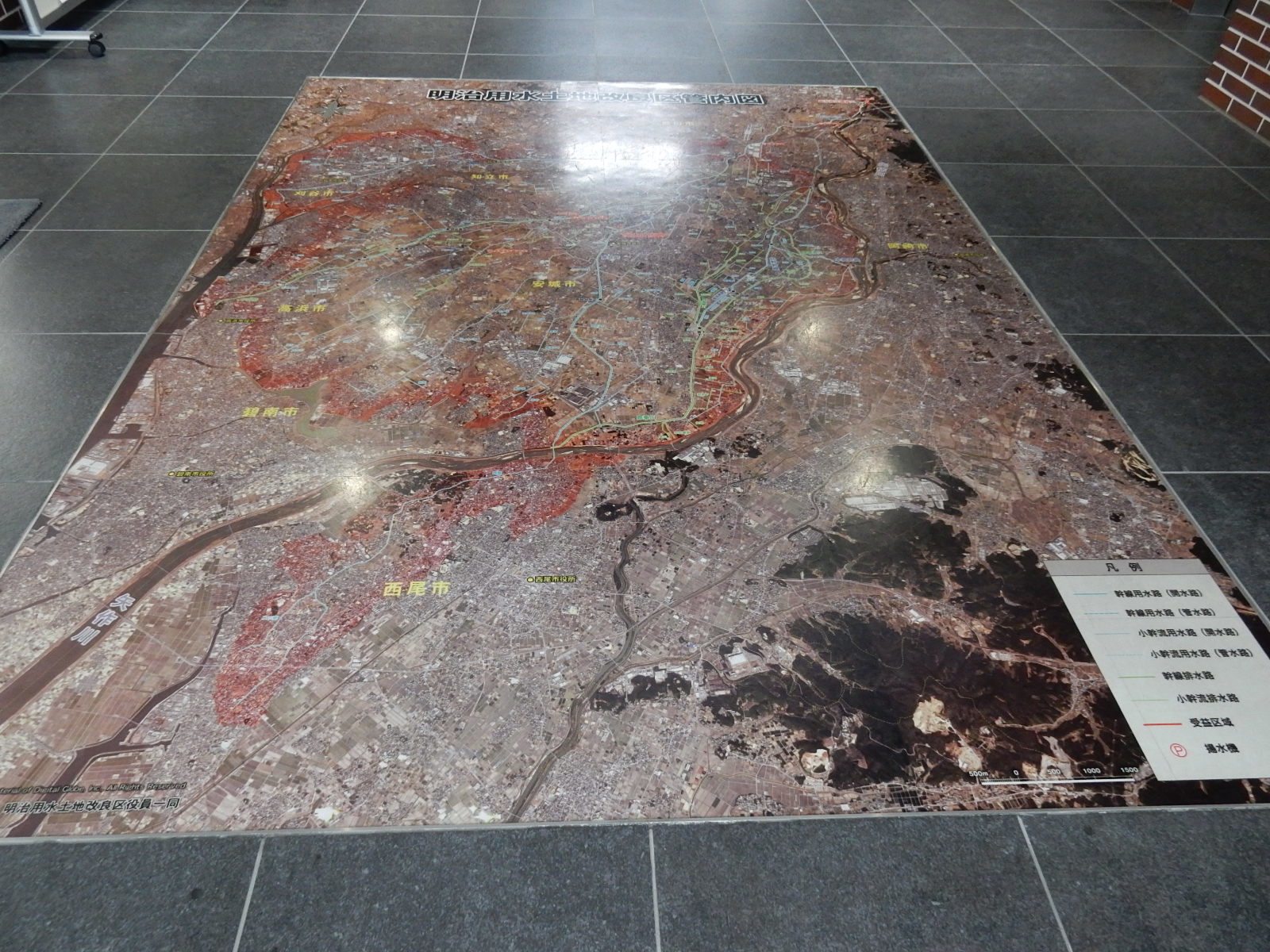 ホールの床タイルに、西三河の巨大な航空写真が印刷されています。