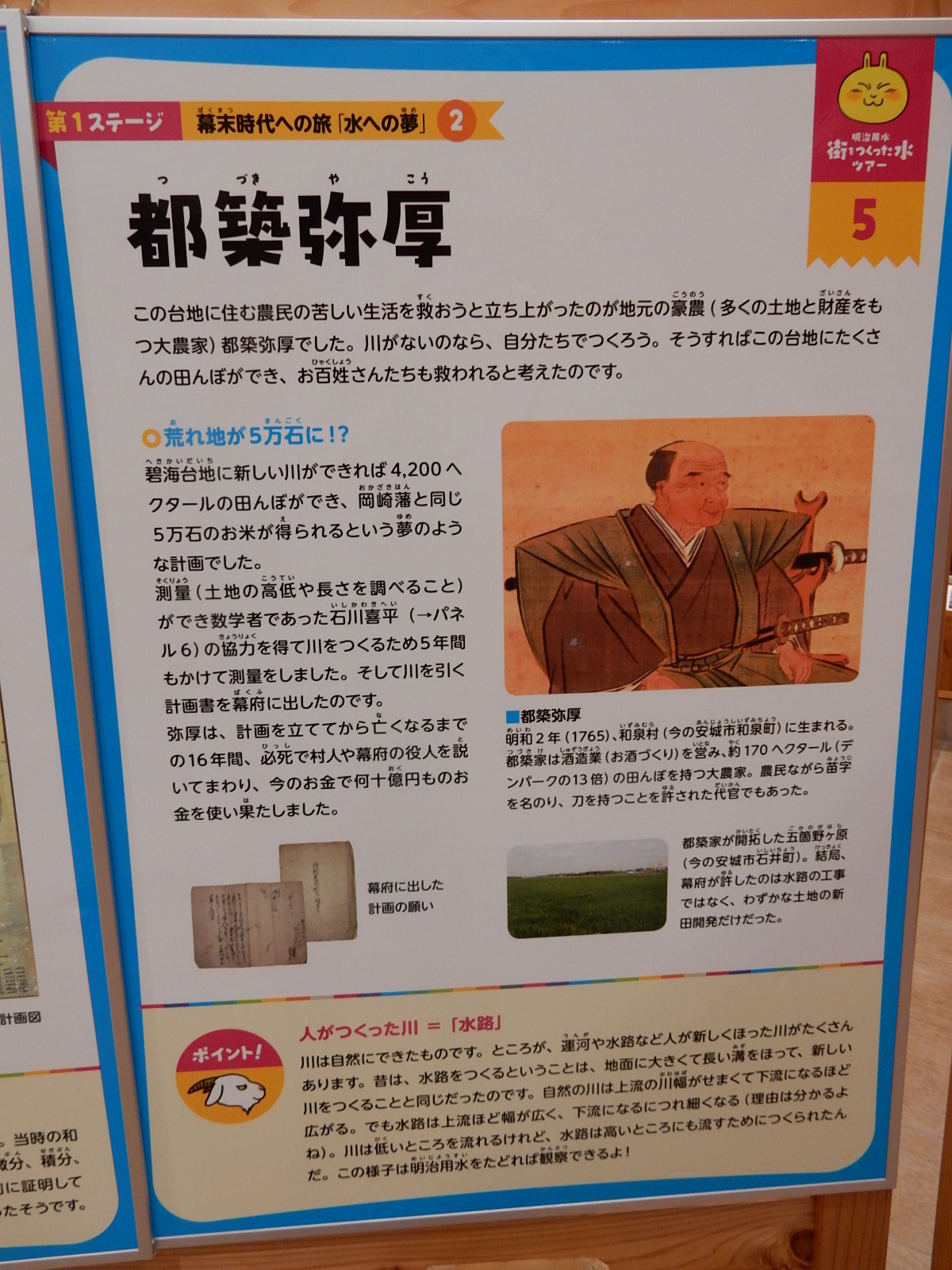 館内に入ると、幕末の明治用水の発案者である、都築弥厚の胸像が出迎えてくれます。