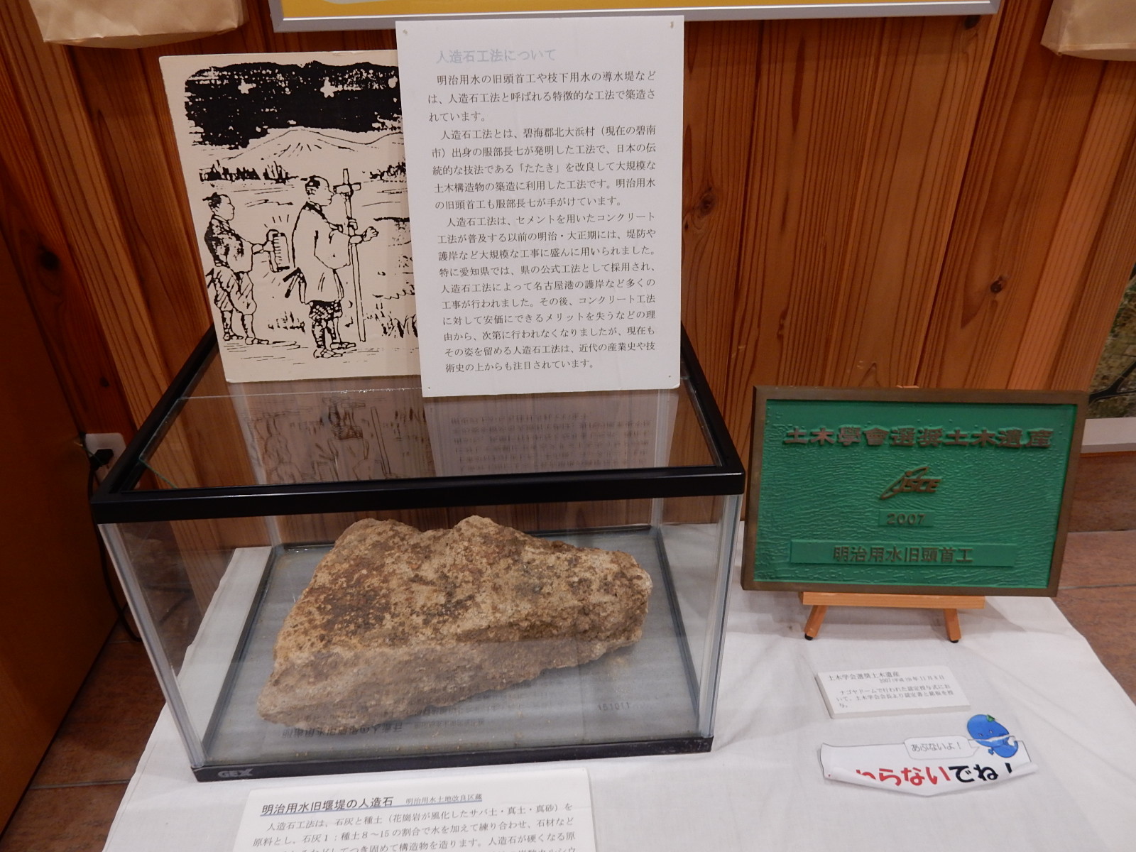 矢作川に設けた頭首工(用水の取り入れ口)で使われた、長七たたきと呼ばれる人造石もありました。