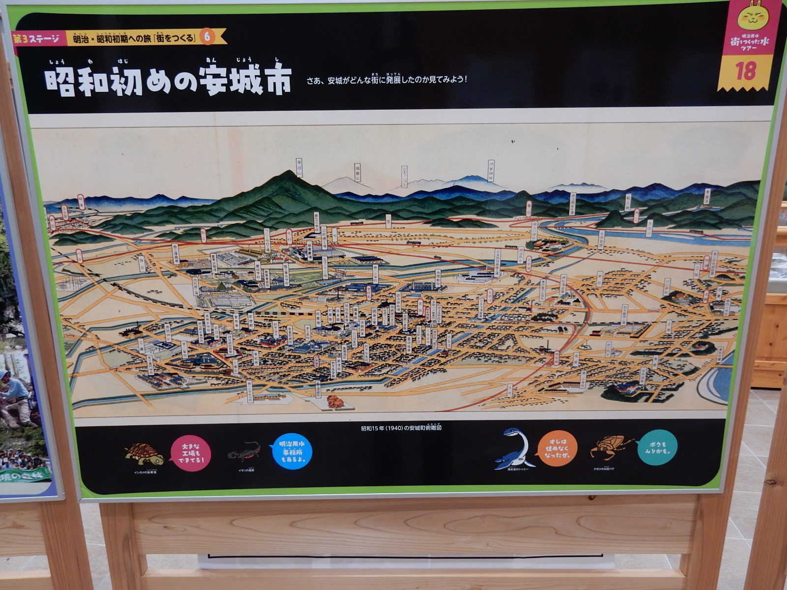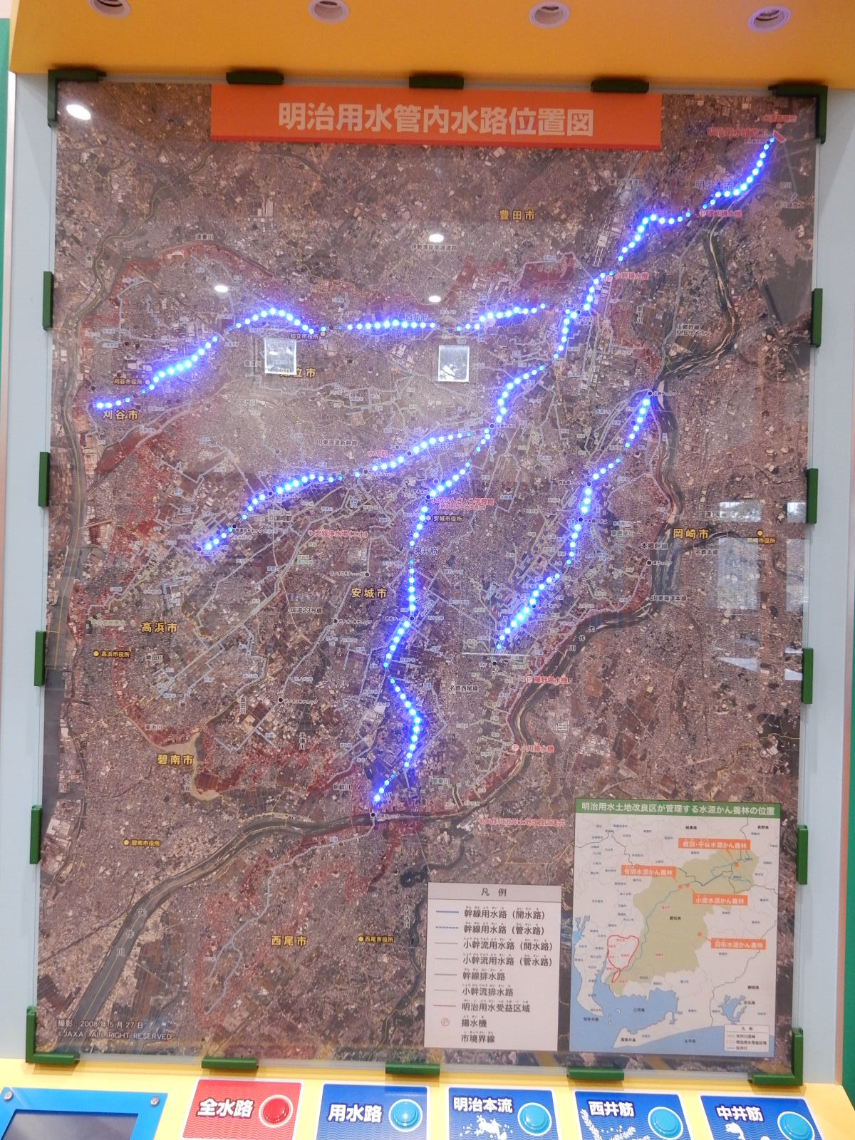 明治用水の幹線ごとや支流などボタンを押して点滅させて、流れる位置がどこかをわかりやすくする、展示マップがありました。