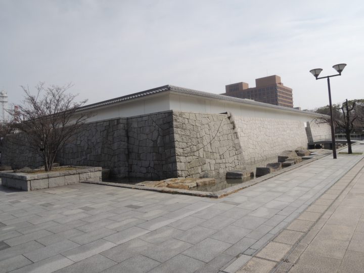 名古屋城正門前駐車場と名古屋能楽堂エリアを仕切る石垣の塀。周囲は池になっており、水堀のイメージです。