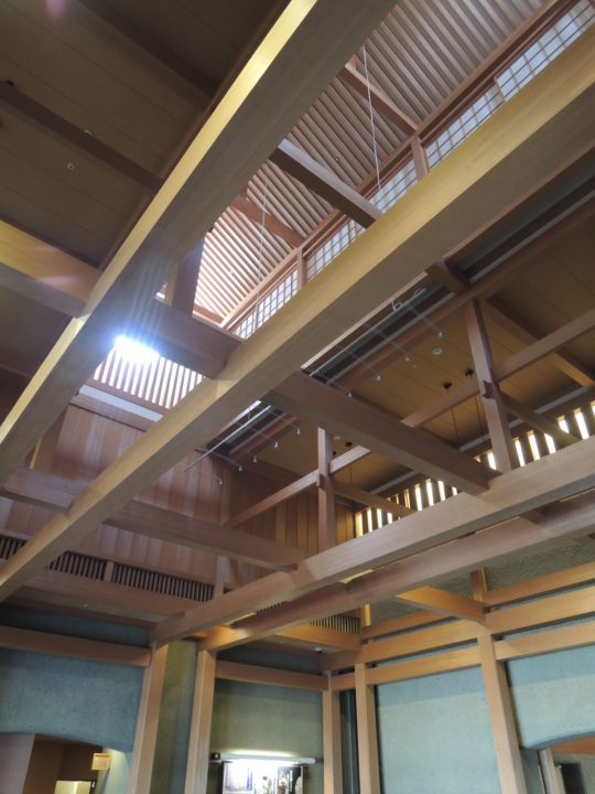 吹抜の玄関広間。木組が美しいです。