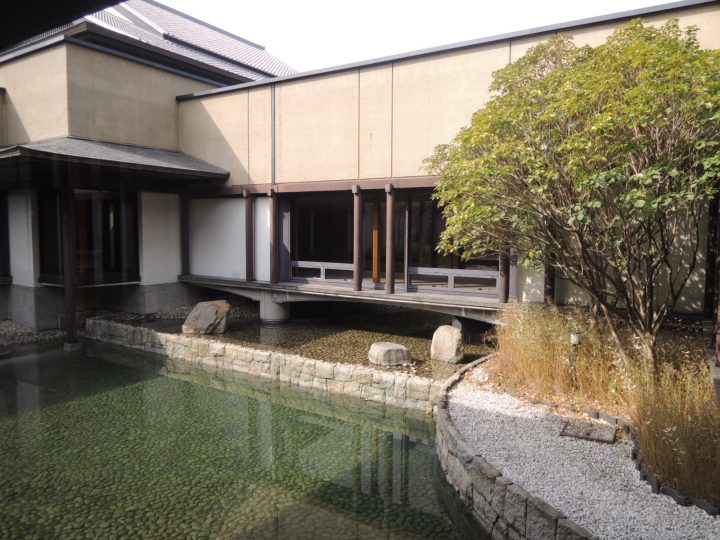 中庭のまわりをぐるりとまわれます。正面は渡り廊下。池の上を渡れます。