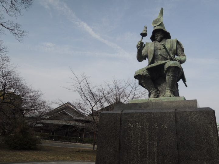 能楽堂の南に、加藤清正像(名古屋出身、熊本藩主、秀吉家臣の大名、関ヶ原の戦いでは東軍、賤ヶ岳の七本槍)があります。