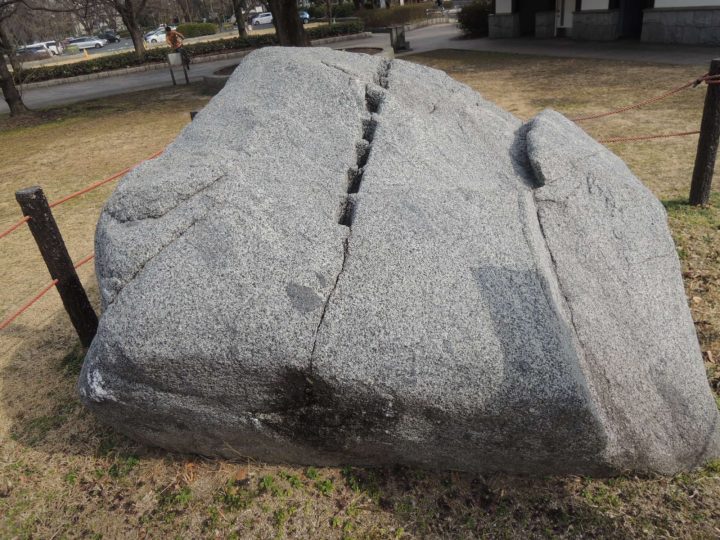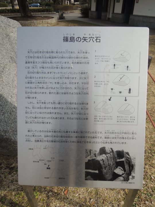脇には、伊勢湾の篠島の矢穴石があります。石垣に使う石を割るために矢穴という穴をあけた状態のものです。
