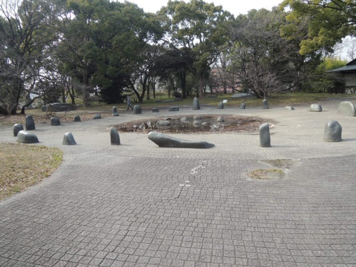 中央に池があり、磨かれた彫刻的な石が周囲を取り囲んでいます。