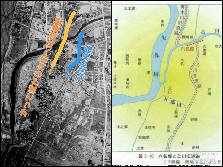 特に大河川である矢作川は、堤がない時代が長く続き、網状に乱流しており、何本も川筋があり、また流れを変えてきています。