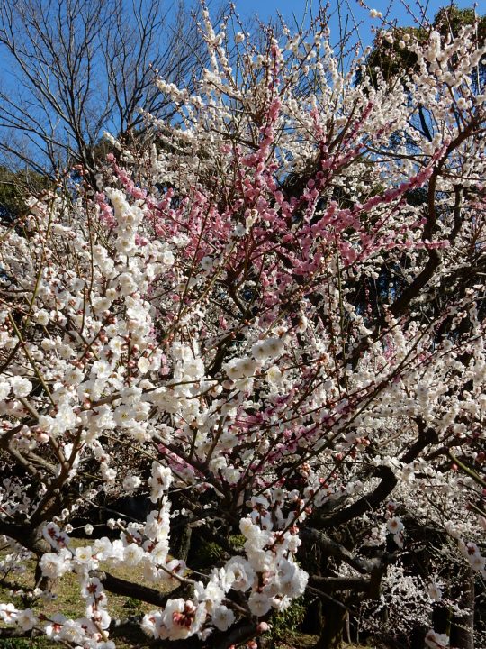 東山梅苑は、山全体に山頂まで、たくさんの梅が咲き誇っています。白梅に紅梅を挿し木した梅もありました。