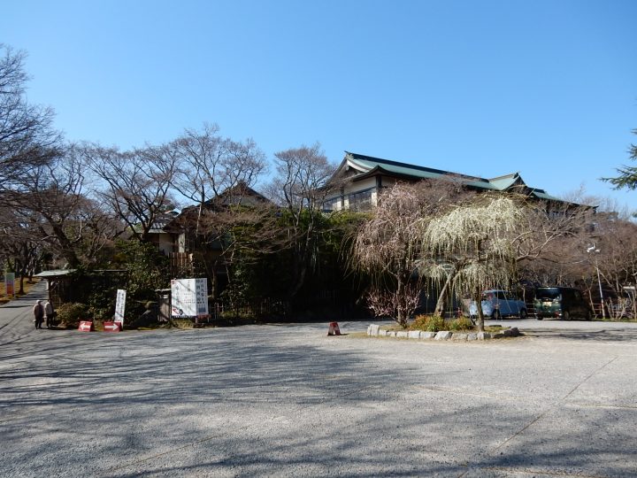 東の駐車場には、枝垂れ梅。その奥に見えるのは、飛梅殿。