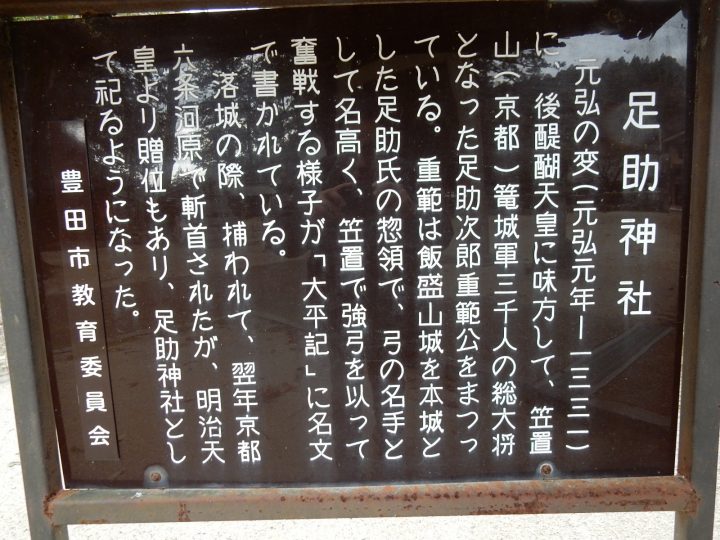足助神社は、鎌倉時代末期に、1331年元弘の乱で後醍醐天皇が鎌倉幕府倒幕の旗をあげ、京都笠置山に立て籠ったときの篭城軍総大将となった武将・足助重範(足助氏の七代目惣領)を祭神として祀っています。