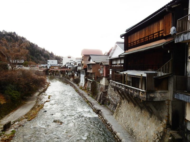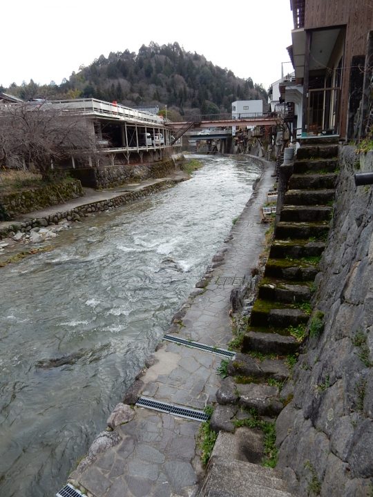 登ってきた坂を下り、足助川にかかる真弓橋に来ると、足助川岸に張り出す建築群が見られます。