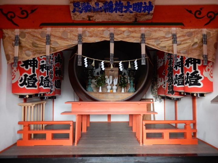 大きな赤い鳥居をくぐって、坂を歩くと、足助稲荷大明社があります。