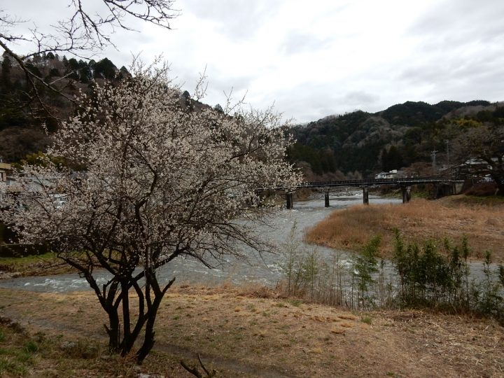 飯盛山の南を流れる巴川と、足助の町の中を流れる足助川の合流部付近の足助川にかかる落合橋。