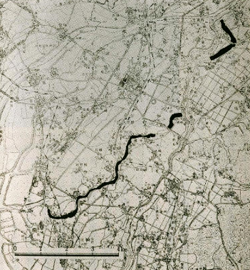 下図で、上が二ヶ崎川。小島町城山付近から始まる川