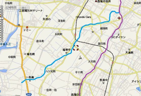 紫が現在の矢作古川で、薄青が弓取川だった流路(旧河道)です。